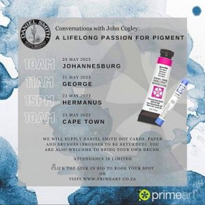 John Cogley, of the incredible Daniel Smith watercolour paints, will be in South Africa shortly and is doing a special talk – ‘A Lifelong Passion for Pigment’ – at The Vryburger in George on 21 May at 11.00 am. There will be paint sample sheets handed out to test and you can win an awesome Daniel Smith Hamper! Register at www.primeart.co.za via their events page, to attend. Limited spots available! You don’t want to miss this!!